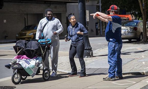 There was a confrontation with one of the members of the group and an African-American family a couple pushing a stroller with two children. The couple later posted on Facebook that a man carrying a pipe-wrench made intimidating comments toward them after they asked the group to keep their distance.