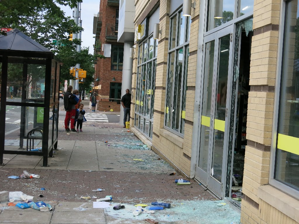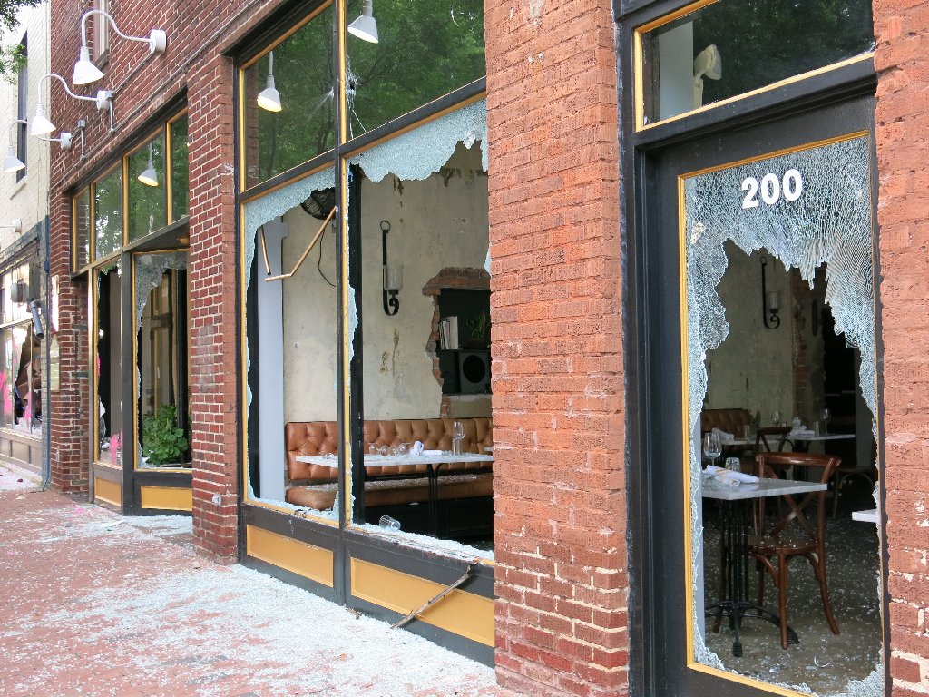 The violence started after dark last night. Apparently there was a peaceful protest beginning around 5 pm. It got ugly after dark. Most of the destruction was on Fayetteville Street, which is anchored by the performing arts center at one end and the State Capitol Building at the other.