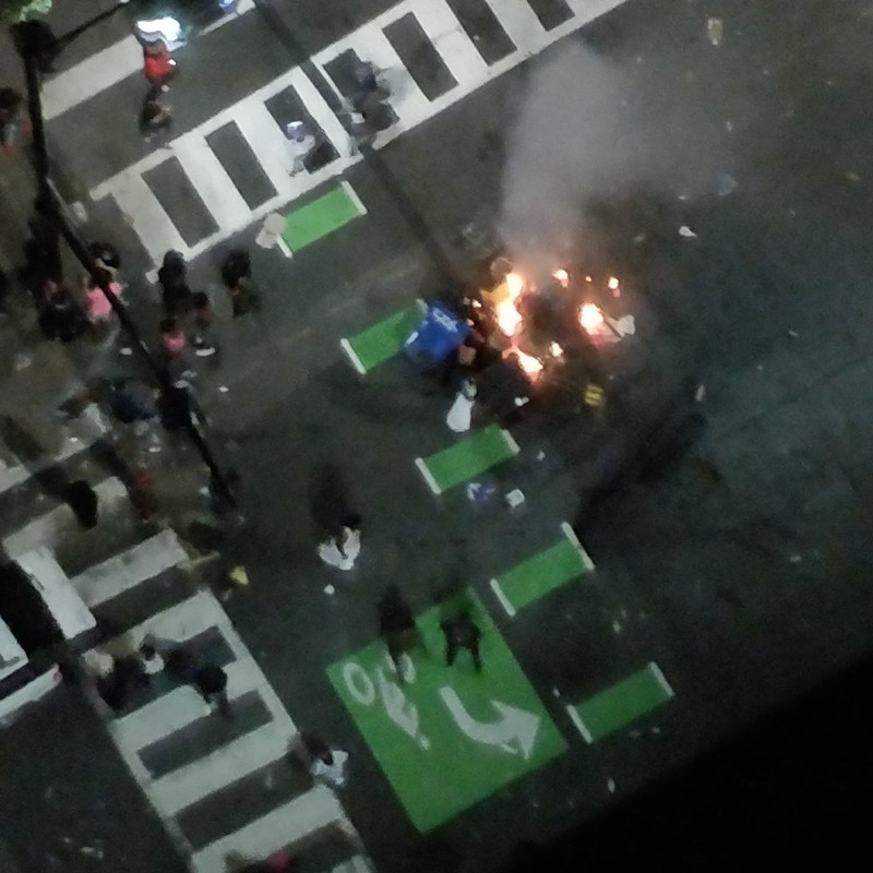 Eventually, part of the crowd came back to the intersection below my apartment. Rolled a garbage bin out in the street and lit it on fire.