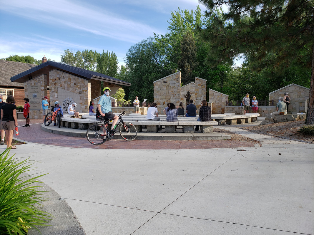 No flags, signs, speakers or anything. Best of all, no yahoos with guns making a scene. Just normal folks, maintaining distance and everyone with a mask. It started at 7:19 with a few soft tones and ended 8'43" later with bells. Just over 50 folks giving a respectful 8 minutes of silence. It was all very somber and sober with a few tears shed.
