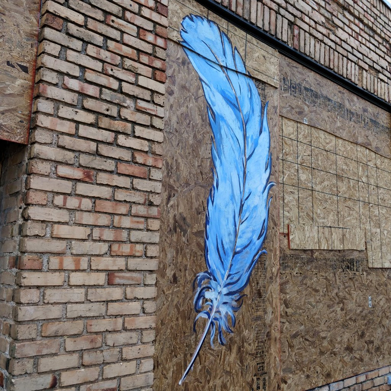 Lots and lots of big plywood boards covering broken windows draw the artists