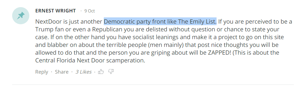 (13,913 posts)Alot of complaining, public shaming, rudeness, hysteria, racism... The company who owns Nextdoor need to implement better policies. I usually get on the site whenever i need a referral for a service, like a plumber or car repair tech, OR if there are safety-related PSA's from the city. OR if i need to sell or buy something. I've stopped reading through the nonsense the neighbors post.