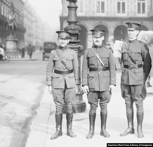 American photographer Lewis Hine (left) with other members of a U.S. Red Cross expedition in November 1918 before they set off on a years long assignment to make a survey of actual needs existing in the various countries where the American Red Cross is engaged.
