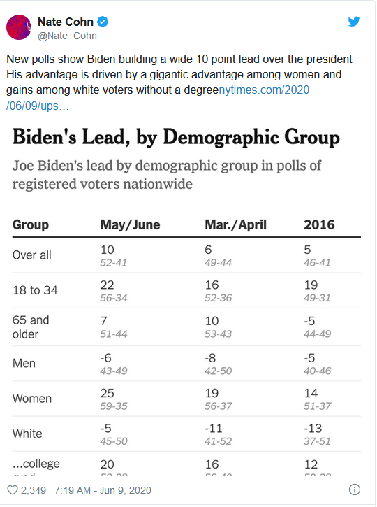 He's right to be nervous. Things are not going well. This week showed some very substantial erosion in his polling numbers. According to Nate Silver at 538, his approval rating is sinking among registered or likely voters 54.9% disapprove of his performance now, compared to 50.3% on April 1. And the head to head match-up with Biden now has him at least ten points behind, as Nate Cohn reports for the New York Times: