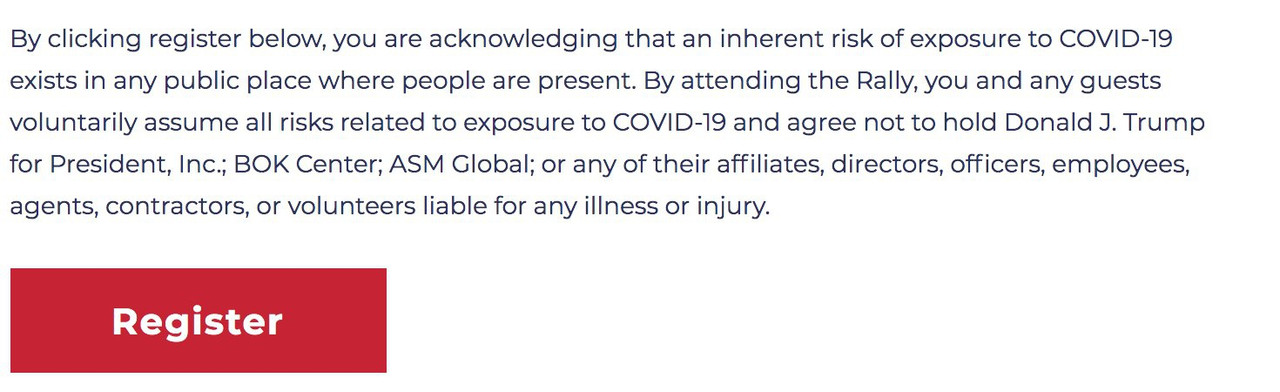 (14,770 posts)If you're looking to attend President Trump's rally in Tulsa next Friday, you must first agree not to sue him if you get coronavirus.