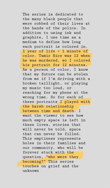 I came across this artist named Adrian Brandon last night. However old the person was when they died, is the amount of time he spends coloring their picture. Tamar Rice was only 12 when he was murdered, so the artist only spent 12 minutes coloring his picture.