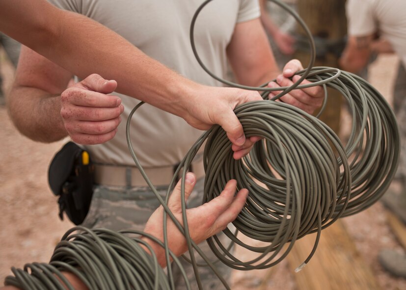 (4,383 posts)Two Rapid Engineer Deployable Heavy Operational Repair Squadron Engineers (RED HORSE) Airmen from RED HORSE units around the Air Force prepare detonation cord to be wrapped around a telephone pole during explosive demolition training at the 820th RED HORSE explosive demolition range on Nellis Air Force Base, Nev., June 9, 2015. The purpose of wrapping the pole is to cause an Abatis shot, which is used to leave obstacles to block routes of travel or egress.