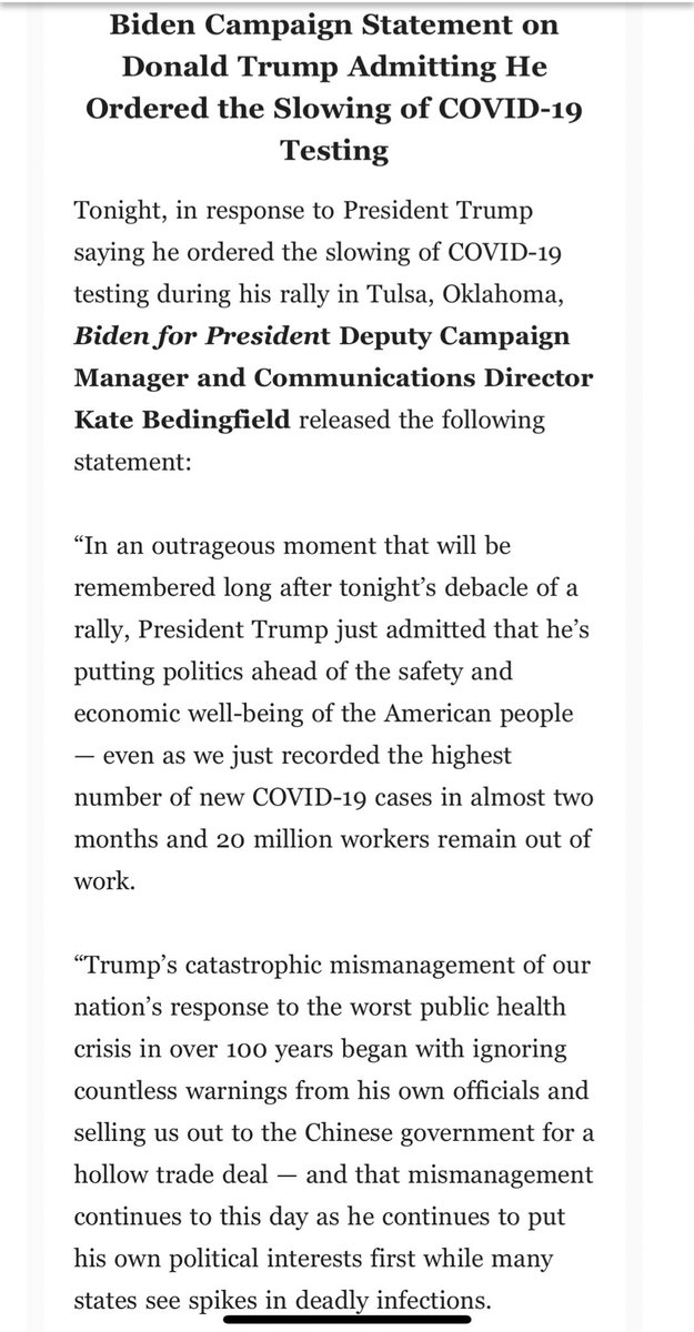 NEW @KBeds statement on Trump admitted he ordered the slowing of coronavirus testing: In an outrageous moment that will be remembered long after tonights debacle of a rally, President Trump just admitted that hes putting politics ahead of the safety...of the American people.