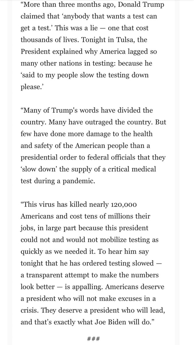 Bidens going to get a lot of mileage out of this. The two video clips of Trump saying anyone can get a test and then saying I told them to slow down the testing are going to be devastating.