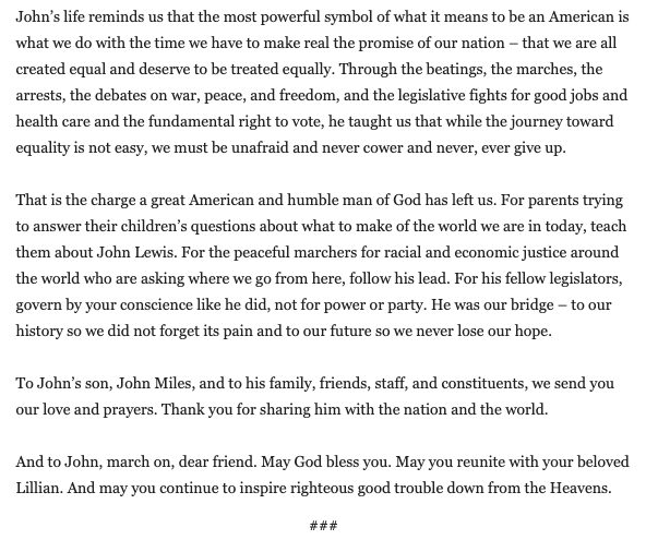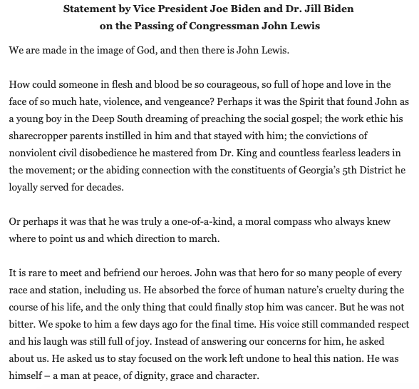 .@JoeBiden and @DrBiden's full statement on the passing of Congressman John Lewis: