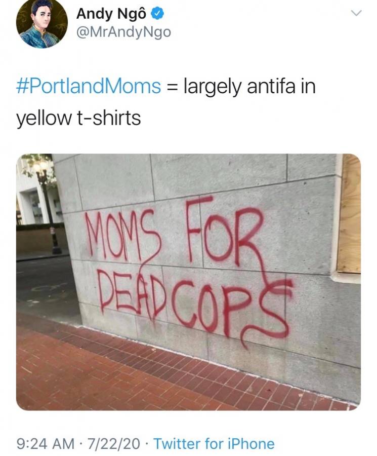 So a bunch of Trumpsters are attempting to discredit the moms who have come out to protest in Portland. Many of them are posting a picture from Andy Ngo's twitter account (see below) in attempts to vilify these women. Given that the source is Andy Ngo, I suspect the picture is bogusperhaps Photoshopped, perhaps from a different location.