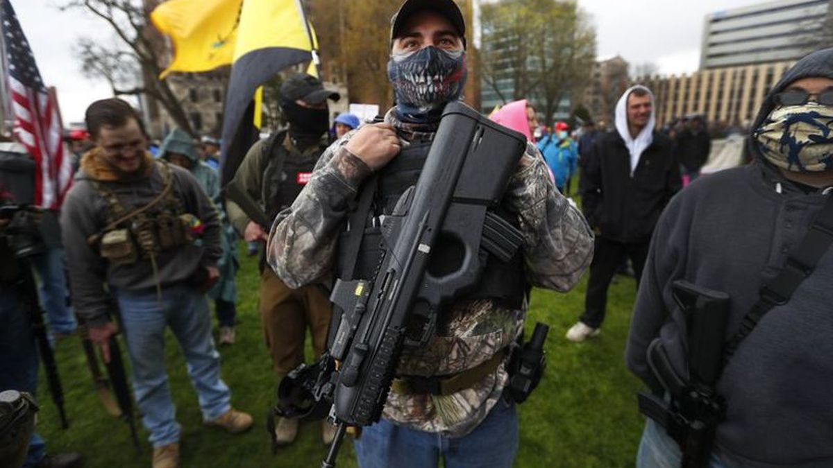 A protester carries his rifle at the State Capitol in Lansing, Mich., Thursday, April 30, 2020. Hoisting American flags and handmade signs, protesters returned to the state Capitol to denounce Gov. Gretchen Whitmer's stay-home order and business restrictions due to the coronavirus pandemic while lawmakers met to consider extending her emergency declaration hours before it expires. (AP Photo/Paul Sancya)(NBC15)