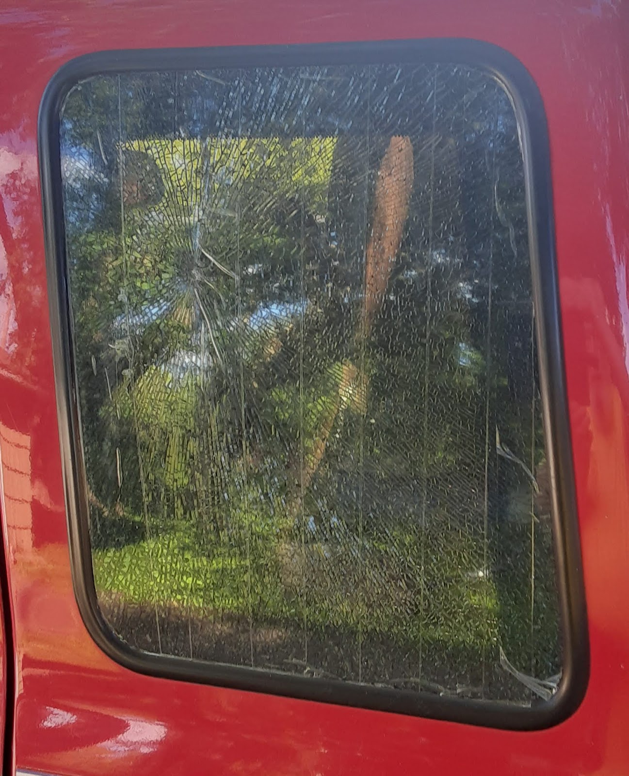 Replacing the window would have cost about $200, or $100, if I replaced it myself. But, all of the fragments were still in place, and I never actually look out that window anyhow. So, I got my roll of Heavy-Duty 3M packaging tape and covered the entire window with it to hold the fragments in place and stabilize the window. As you can see, I did my usual sloppy job of taping, but the window will remain in its place.