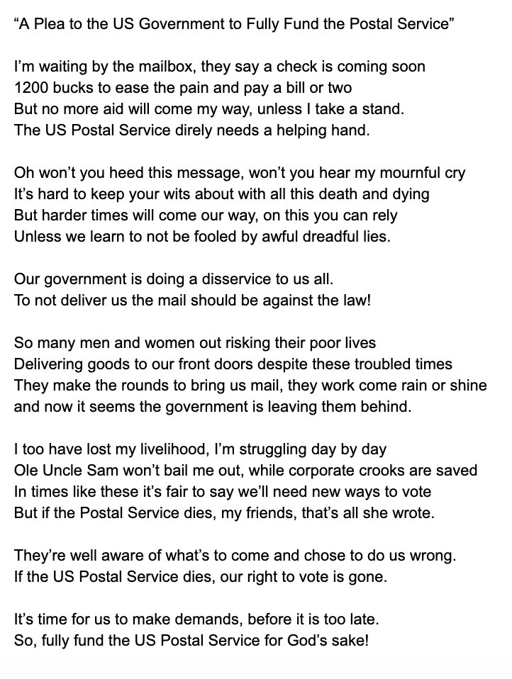 (5,960 posts)"A Plea to the US Government to Fully Fund the Postal Service" - Joe Troop