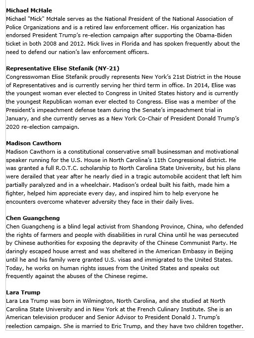 I don't want to say most of them are crazy, but.... Marsha Blackburn, Kayleigh McKeneny, Kellyanne Conway, Elise Stefanik (I remember her from trump's imeachment... she is a pal of gym jordan and matt geotz), Lara Trump, Joni Ernst..... and Mother & Mr. Pence. Expect major ass kissing from Mr. pence ... he's out there campaigning for himself for 2024.