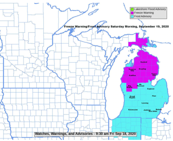 The map showing no advisories for the central & western Upper Peninsula is because the growing season is over up there.