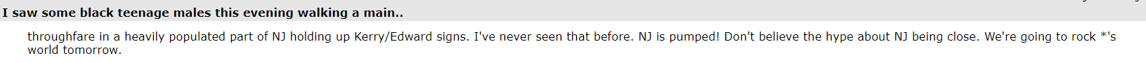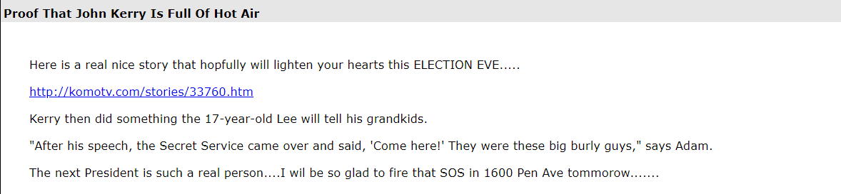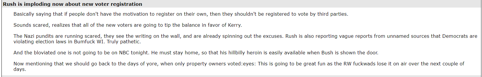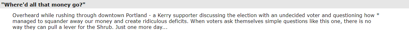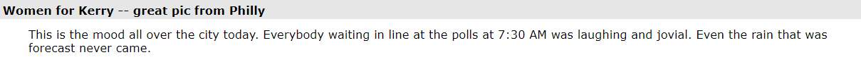 (21,998 posts)What was the mood like? Did everyone think Kerry would win, or did some say Bush would be re-elected? I would love to see an archive of those posts.