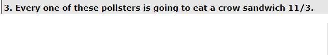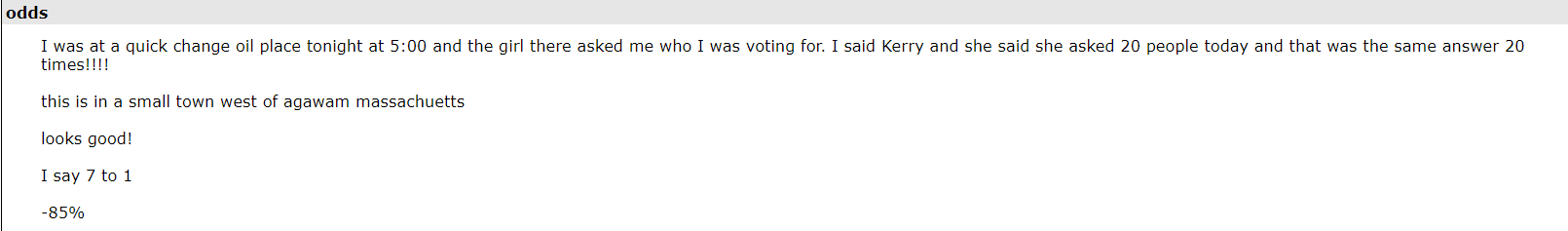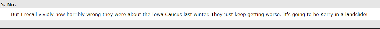 (14,565 posts)A math guy named TruthIsAll had bombarded the site for months with fancy formulas asserting Kerry at 99.99% likelihood to win. He based it on unskewing the polls and also assigning an absurd percentage of the undecideds to Kerry as challenger.