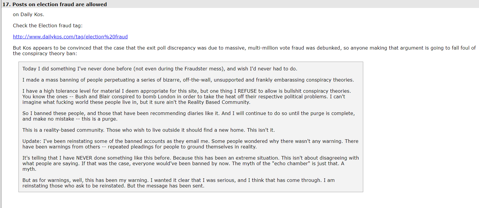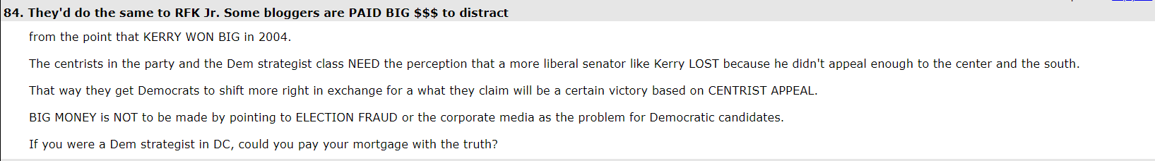 That 99.99% avalanche brainwashed the site in general. Too many posters believed there had to be plenty of legitimacy, if someone with fancy mathematical degrees was so insistent. There were many more active major political forums on this site in those days. TruthIsAll hammered every one of them. You couldn't escape his latest thread because he'd post it 6 or 8 different places. Then he got furious at myself and a few others for following him around to all the forums, pointing out his latest mistake in every one of them.