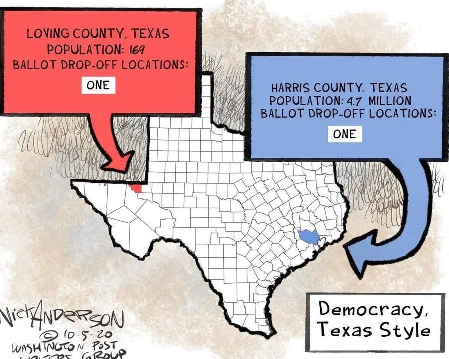 Related: Editorials & Other Articles, Issue Forums, Alliance Forums, Region ForumsMean while- Texas voter suppresion, or "Where's the ballot-drop off box?"