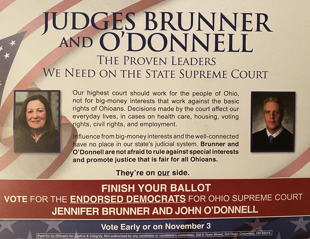 If Democrats Jennifer Brunner, a Columbus appellate judge, and John O'Donnell, a Cleveland trial court judge, succeed in winning six-year terms, the party long out of power in the ornate courtroom on Front Street will secure a 4-3 edge.