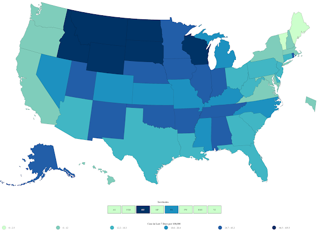 Then, look at the darkest blue colors, which indicate higher per capita infection rates. States in the upper Midwest are showing the largest block of high infection rates. The states in dark blue are all deeply red states.