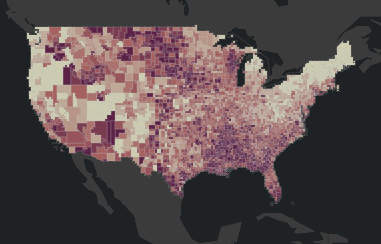 If you click on a state, it will show you the counties, with a similar scoring system coloring the counties -- for which you can then click on a county of interest to see the actual numbers.