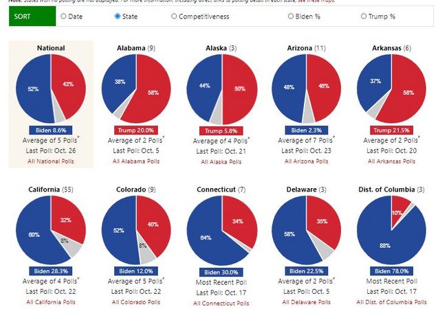 Using the selection bar at the top you can select how the pie charts are listed; by state, by latest polls, by competitiveness, etc. Hadn't seen any mention of this site since July so just thought I'd share. For me I absorb information better in graphic form, so it's appealing to me.