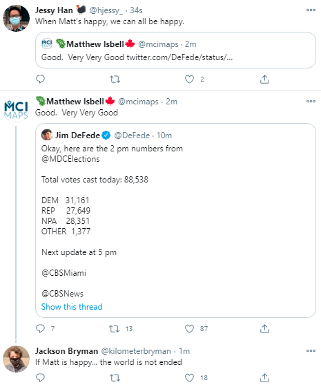 Remember, 63% had already voted in Miami-Dade prior to today. Add the fact Democrats are doing okay in election day votes here, and that is NOT bad news or 'rough'. There's a reason the twitter dude quoted in this thread appears happy.