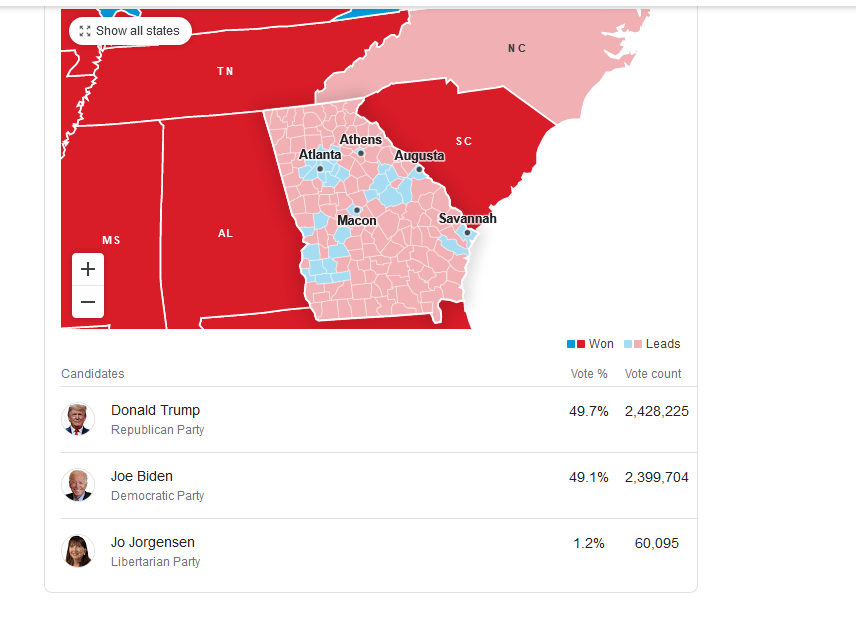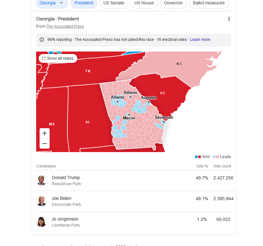 (13,542 posts)13. The votes are coming. From Atlanta and Savannah, reliably Blue areas within this Red(neck) state