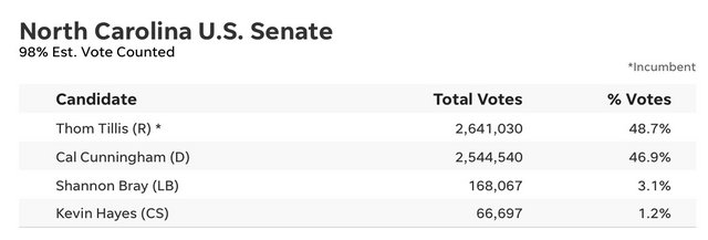 Votes are still being counted. If NC has the rule where the candidate doesn't reach 50% of the votes, then this should be going to a runoff as well.
