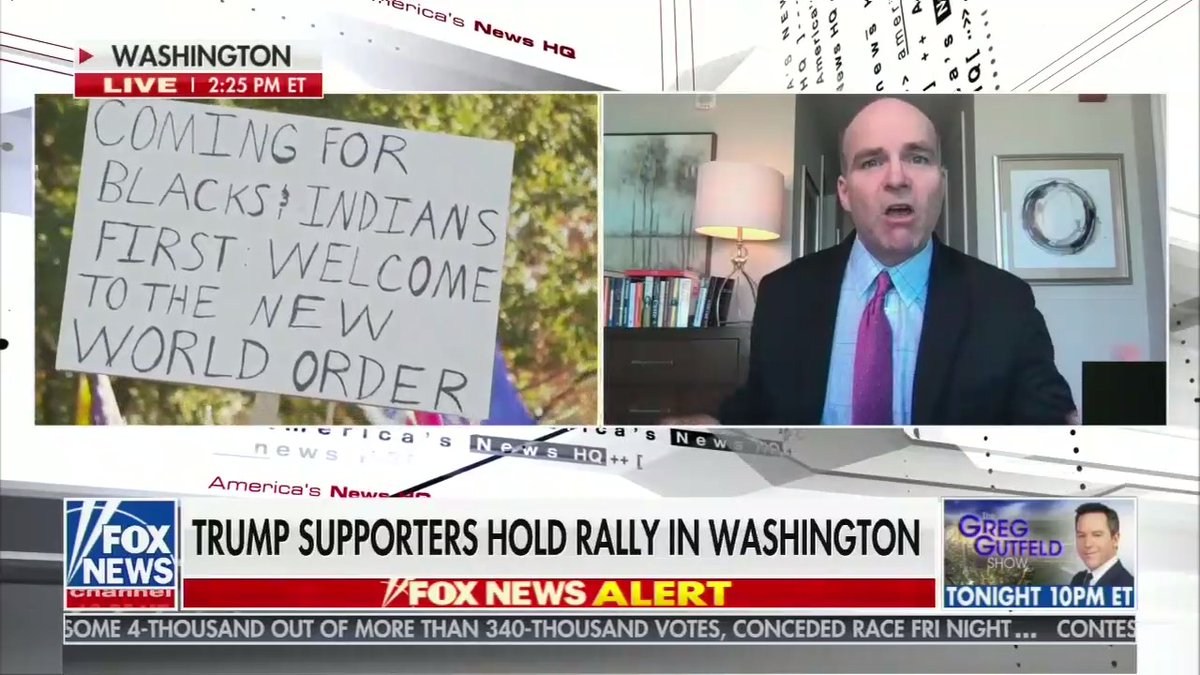 Fox anchor Eric Shawn, somewhat shaken, responds to his show's live B-roll of today's MAGA rally in DC: "We just saw a very disturbing sign, it said 'Coming for Blacks and Indians, welcome to the New World Order.'"