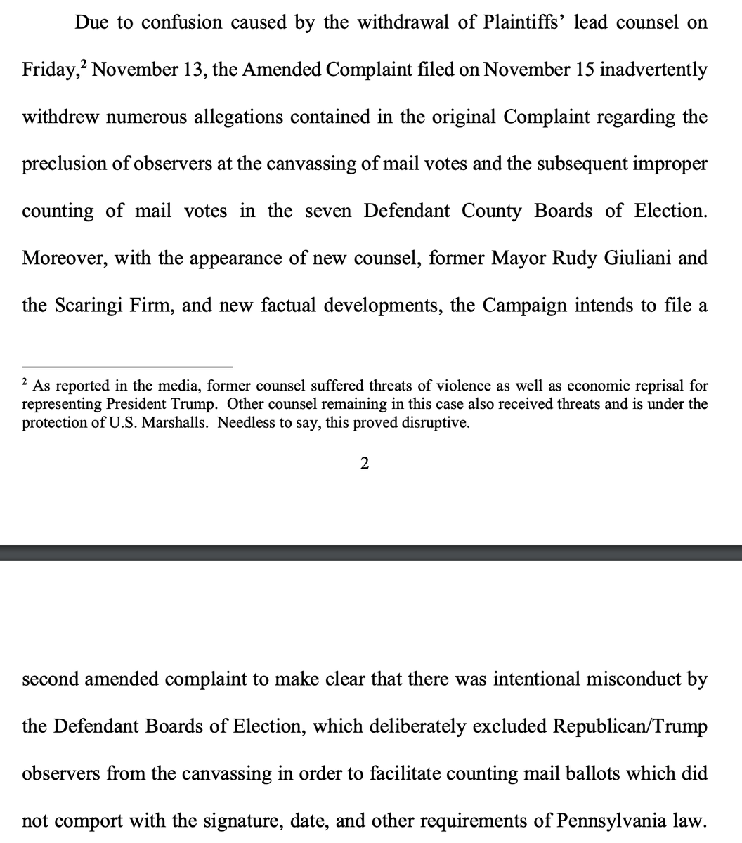 The Trump campaign says that its first amended complaint "inadvertently withdrew" large sections devoted to their (unsubstantiated) observer claims due to "confusion caused by the withdrawal of [their] lead counsel." Don't miss the footnote. https://courtlistener.com/recap/gov.uscourts.pamd.127057/gov.uscourts.pamd.127057.170.0_1.pdf