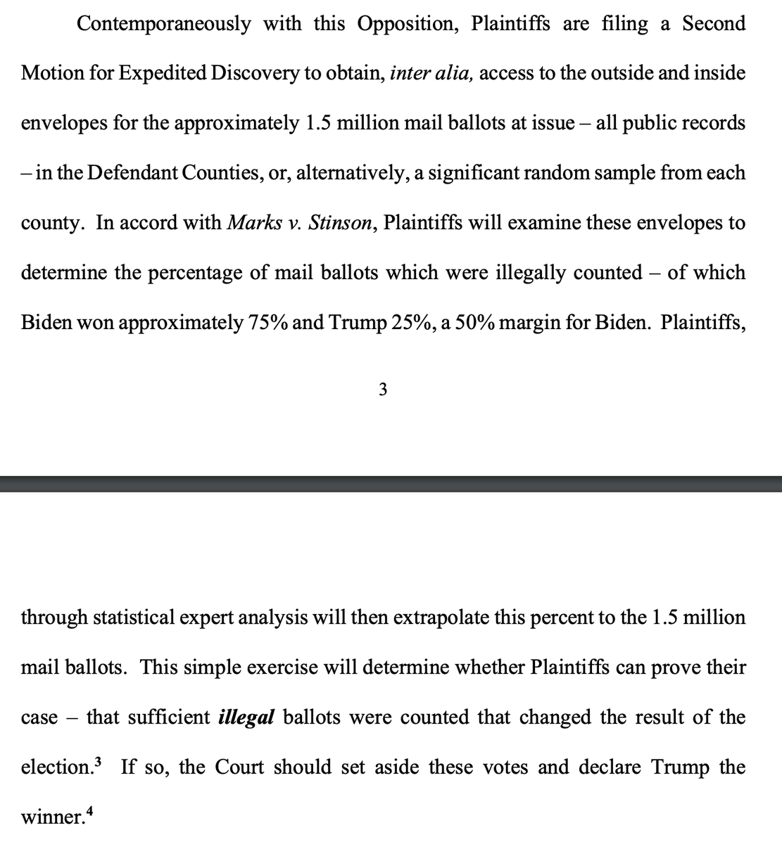 The Trump campaign's proposal--literally I am not making this up--is that *THE TRUMP CAMPAIGN* will obtain and count all or a subset of the Pennsylvania mail ballot envelopes and, based on the formula in footnote 3, let the judge know if he should declare them the winner.