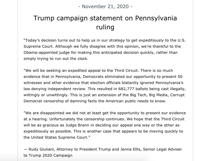 In which the Trump campaign's lawyers say they are "thankful" a federal judge laughed their claims out of court as wholly meritless & unsubstantiated because it will allow them to appeal the case faster