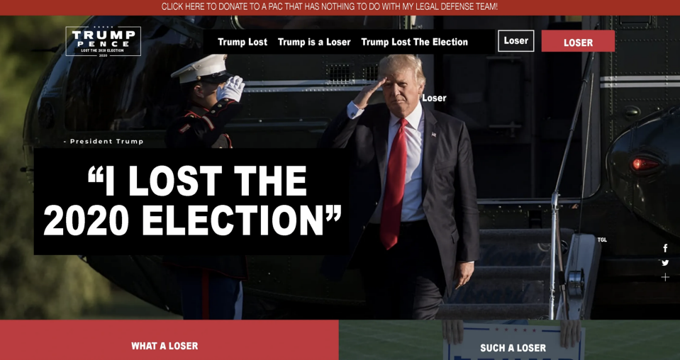 The words “lost” and “loser” make several appearances on the parody site, which also jokes about raising money for a PAC that has “nothing to do with (Trump’s) legal defense team.”