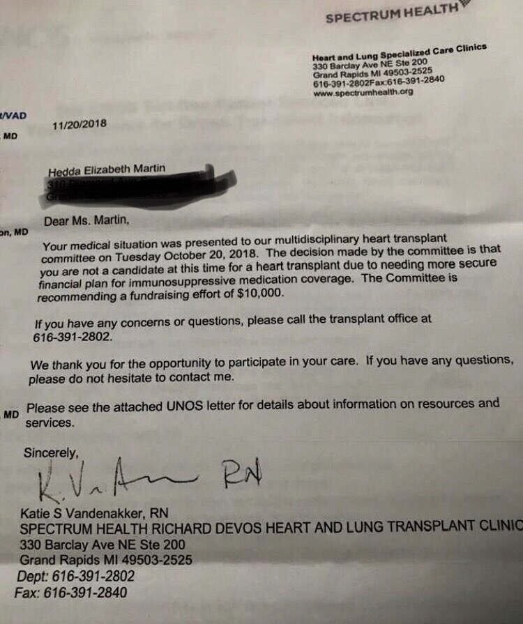 A transplant committee with the Grand Rapids-based hospital system previously ruled Martin ineligible, citing her lack of financial wherewithal to afford the necessary anti-rejection drugs with the $4,500 annual deductible in her Medicare plan.