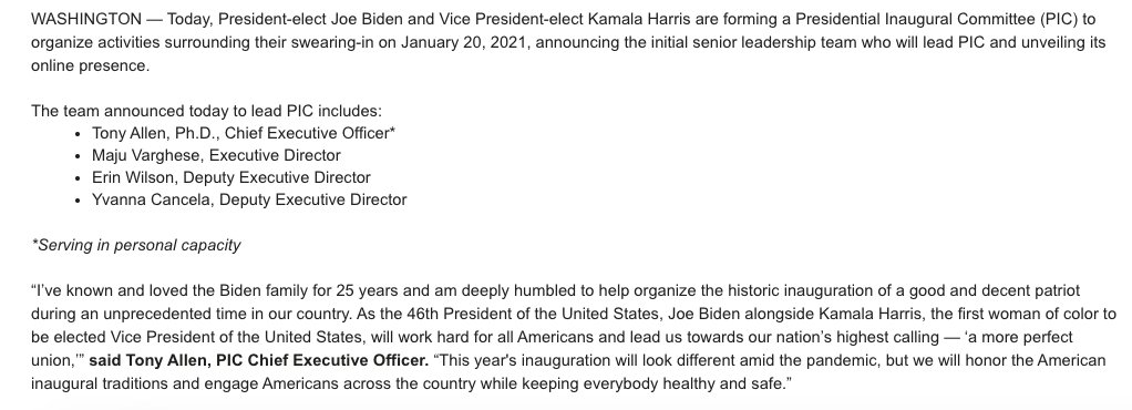 Biden and Vice President-elect Kamala Harris are forming a Presidential Inaugural Committee (PIC) a (Original Post) soothsayer Nov 2020 OP