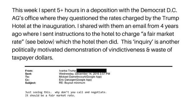 thats the point entirely. after Ivankas exculpatory email, an outside advisor weighs in, cautions the group that they are still veering into criminal behavior - price remains overblown ($100K) for a non-competitively sourced, private family party at the comitees expense.