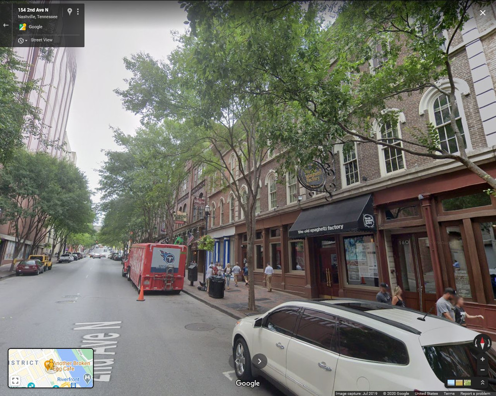 Locating the Spaghetti Factory in the 1st pic, I believe that is from a (generic) view looking along the same street but from the other end, where the garage seen in the 2nd pic (and in the video) is behind you. I.e., both the Spaghetti Factory and the Melting Pot restaurants were almost directly across from the AT&T building.