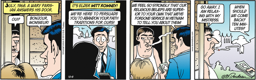 (317,702 posts)If Willard isn't weird enough..he went to France to push Mormonism on people during the VietNam War after he was Pushing for The Viet goddamn Nam War.