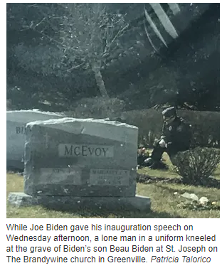 I saw a lone man in a blue uniform kneeling at Beau's grave. No one else was around on this cold, windy afternoon except for a few people doing outside work at the cemetery. In my car, I had the radio tuned to CNN. Joe Biden was being sworn in as president and was about to begin his address.