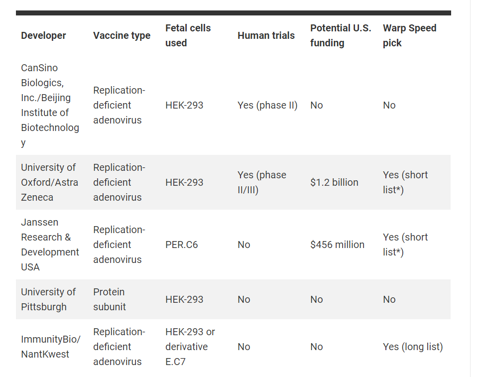 At least five of the candidate COVID-19 vaccines use one of two human fetal cell lines: HEK-293, a kidney cell line widely used in research and industry that comes from a fetus aborted in about 1972; and PER.C6, a proprietary cell line owned by Janssen, a subsidiary of Johnson & Johnson, developed from retinal cells from an 18-week-old fetus aborted in 1985. Both cell lines were developed in the lab of molecular biologist Alex van der Eb at Leiden University. Two of the five vaccines have entered human trials (see table, below).
