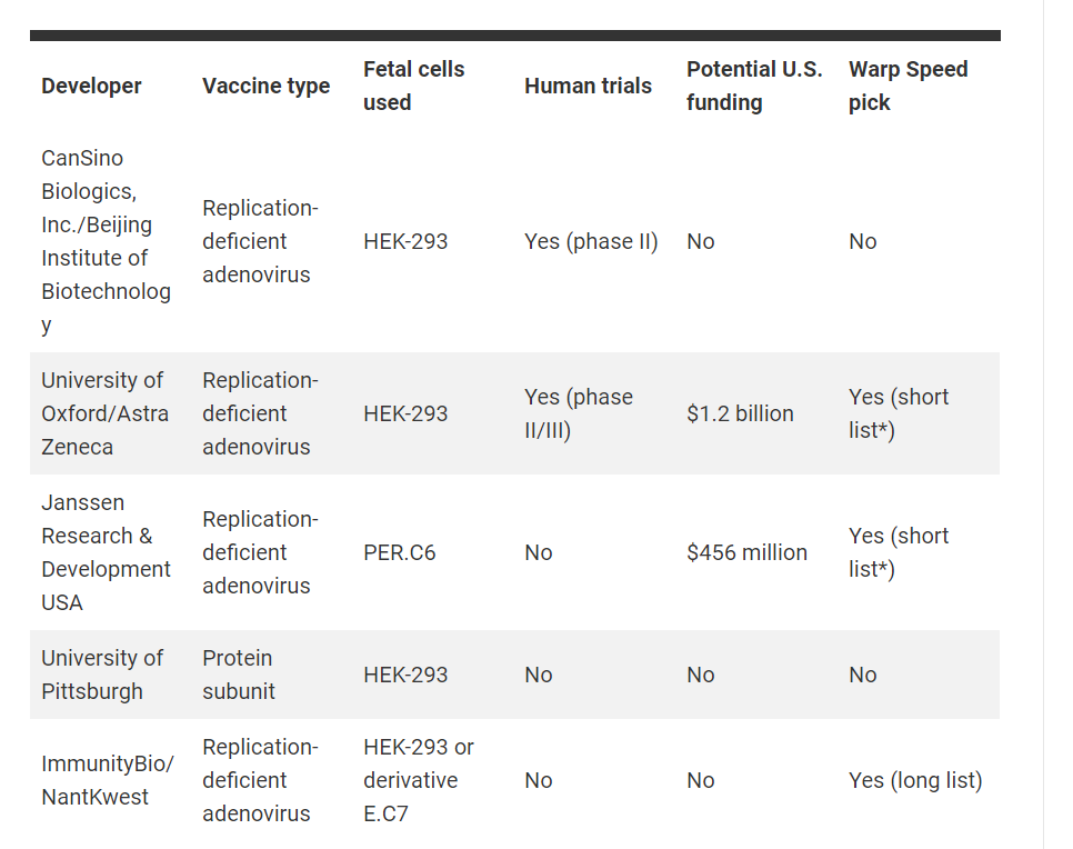 David Prentice, vice president and research director at the Charlotte Lozier Institute, which opposes abortion, notes researchers making adenovirus vaccines have modified HEK-293 cells to be adept at packaging new genessuch as those that direct cells to assemble the coronavirus spike proteininto adenoviruses. But he adds that other technologies are available, including using cells captured from amniocentesis that are engineered to make replication-deficient adenoviruses. The use of cells from electively aborted fetuses for vaccine production makes these five COVID-19 vaccine programs unethical, because they exploit the innocent human beings who were aborted, Prentice and a co-authormolecular biologist James Sherley, a Lozier Institute associate scholar and director of the adult stem cell company Asymmetrexwrote in a position paper published last month.