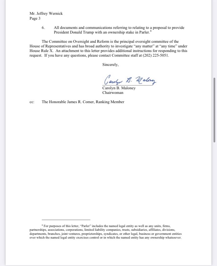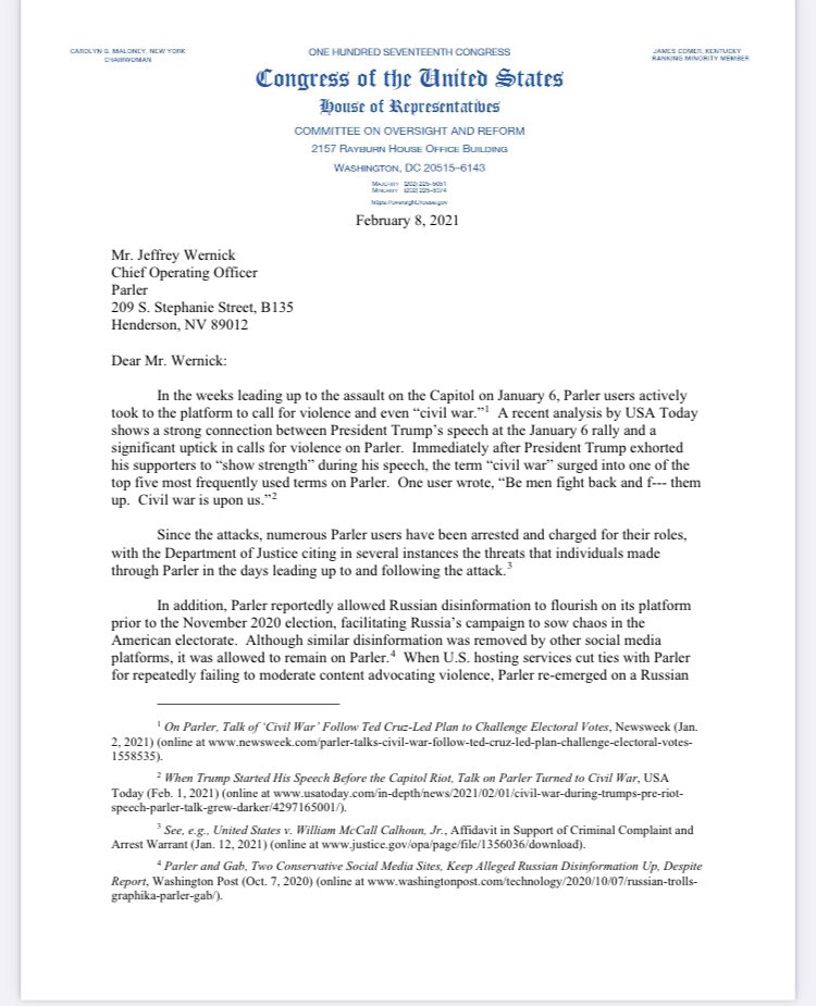 NEW: the head of the US Committee on Oversight and Reform has sent a letter to social media platform Parler demanding it hand over docs related to its finance and foreign ties - including to “any Russian individual or entity”