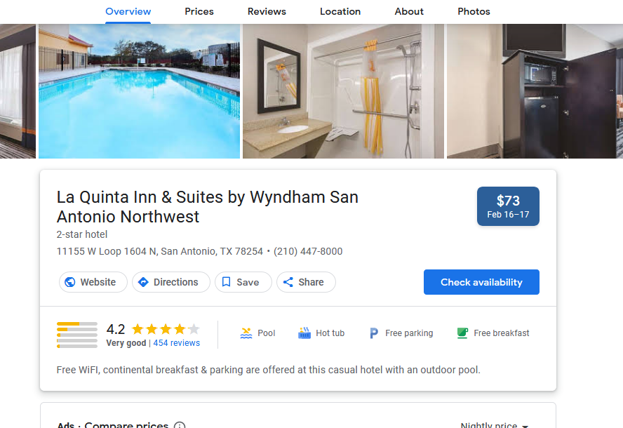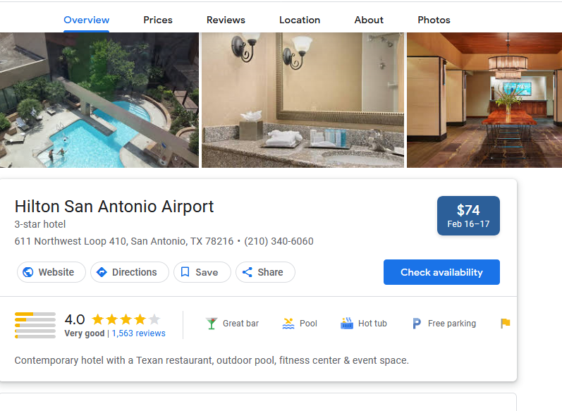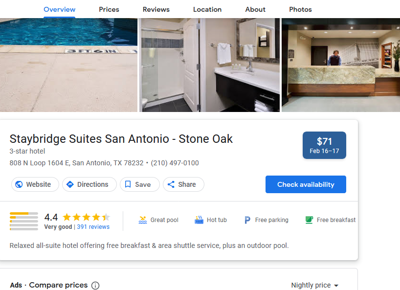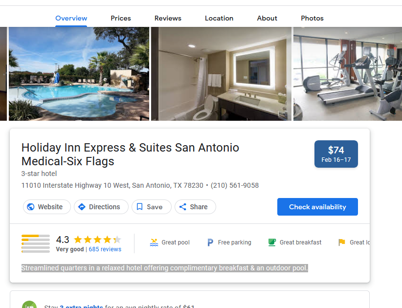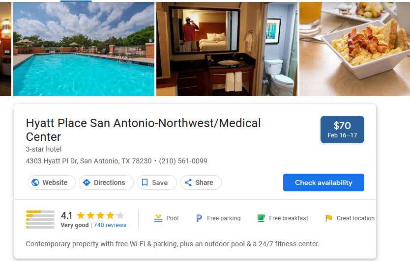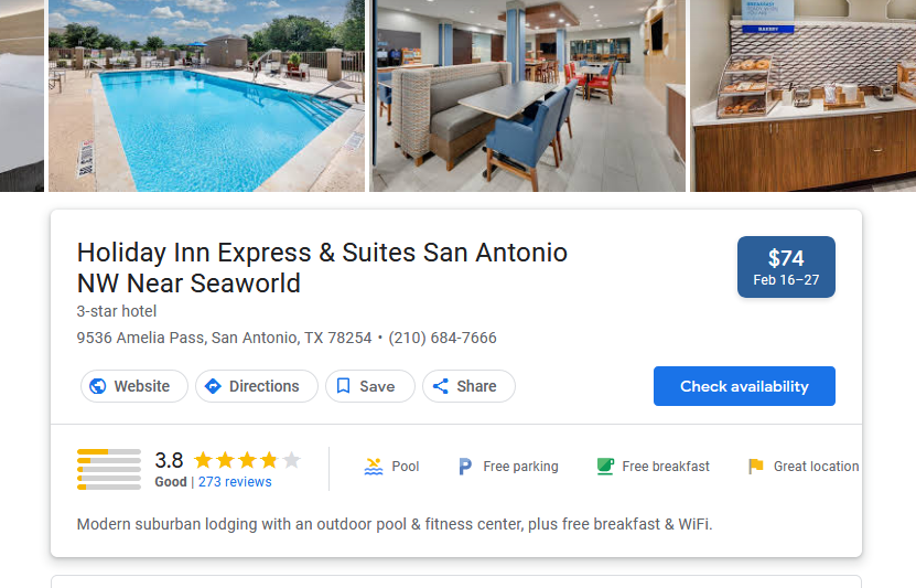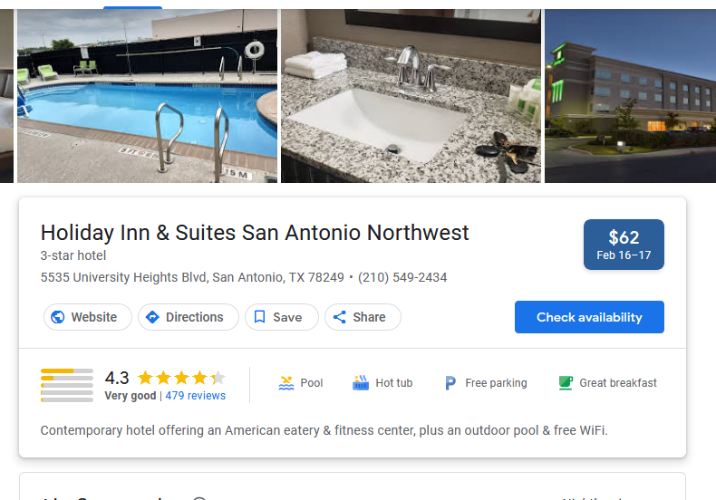 But there is not a single overly expensive suburban motel near me for the night of Feb 16-17. These are all decent accommodations. They aren't on the Riverwalk, but I would stay at any of these locations!