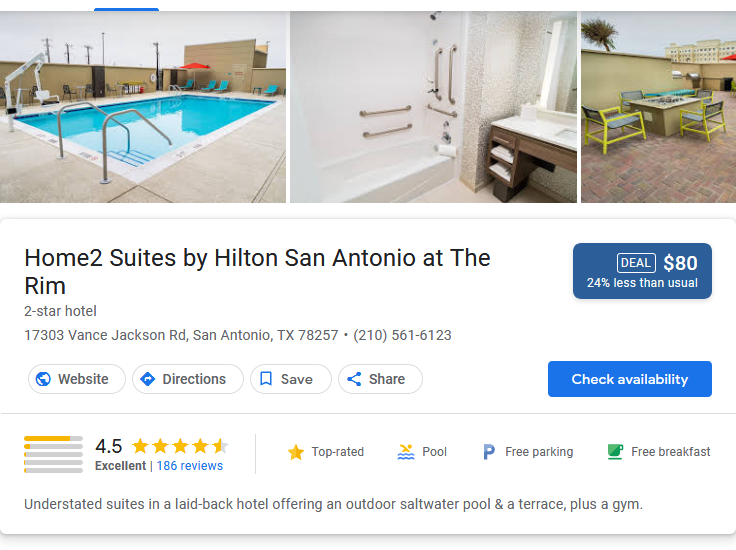 (34,031 posts)I live in San Antonio, not some cow town... I checked the decent motels/hotels such as Holiday Inn Express. I did not even check Super 8, Motel 6 or scum of the earth like Ramada and Knights Inn: