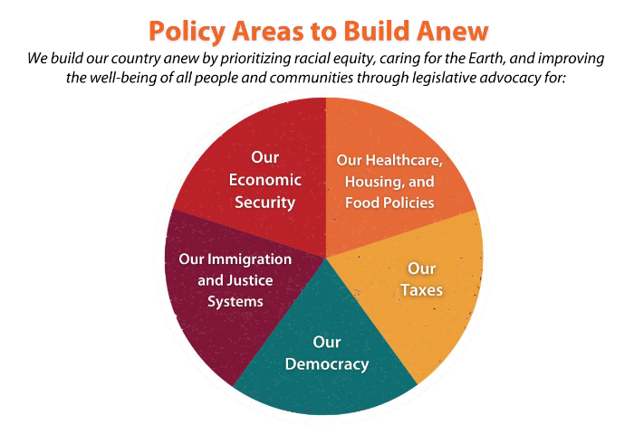 In a world of growing economic disparity and increasing individualism, we call for federal policies that dismantle systemic racism, eliminate the wealth and income gap, improve the well-being of our communities, and allow all people to thrive especially those most often left out: women, people of color, and people on the economic margins.