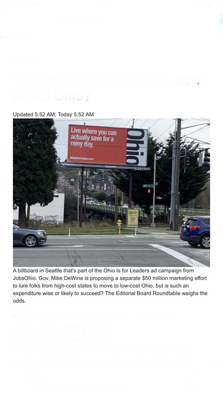 A billboard in Seattle that's part of the Ohio Is for Leaders ad campaign from JobsOhio. Gov. Mike DeWine is proposing a separate $50 million marketing effort to lure folks from high-cost states to move to low-cost Ohio, but is such an expenditure wise or likely to succeed? The Editorial Board Roundtable weighs the odds.
