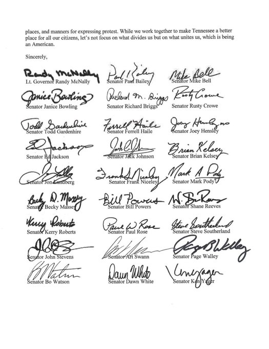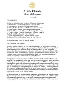 Every GOP member of the Tennessee Senate has signed a letter after the mens basketball team at East Tennessee State University knelt during the national anthem.